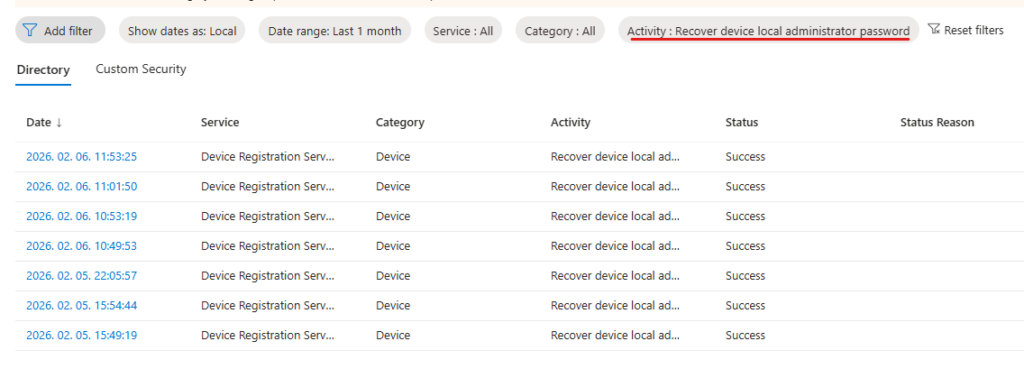 If you want to see the audit events, look for “Recover device local administrator password” activity type in Entra Audit logs: