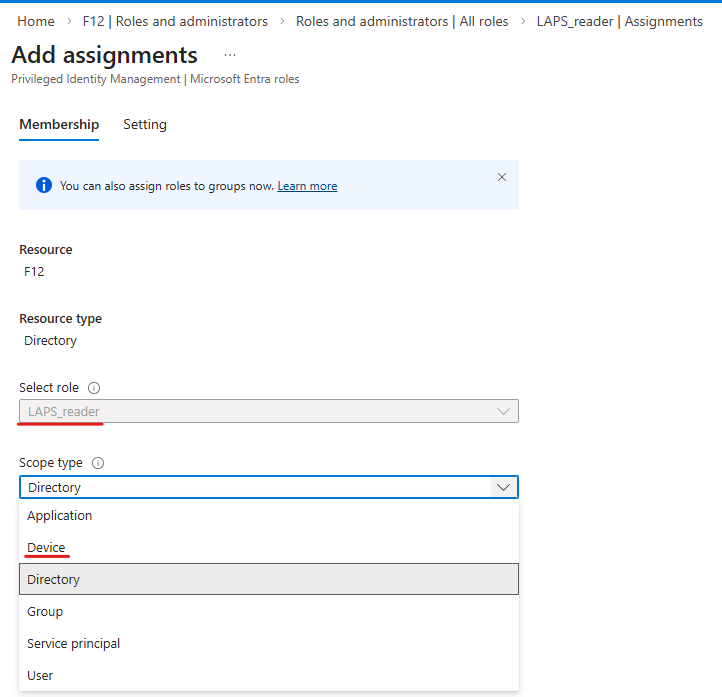 Next, if you have Entra P2, when you assign a role to a user, you can select “Device” as a scope type: