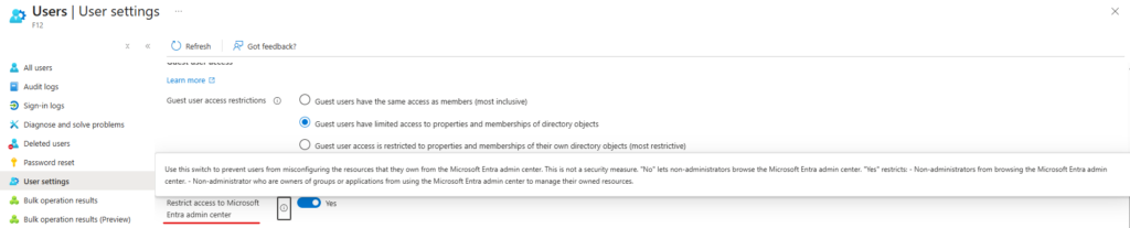 *By giving a Role assingment to a user, it will be considered as an “administrator” – so these users will be able to access the portal even if “Restrict access to Microsoft Entra admin center” option is set to yes: