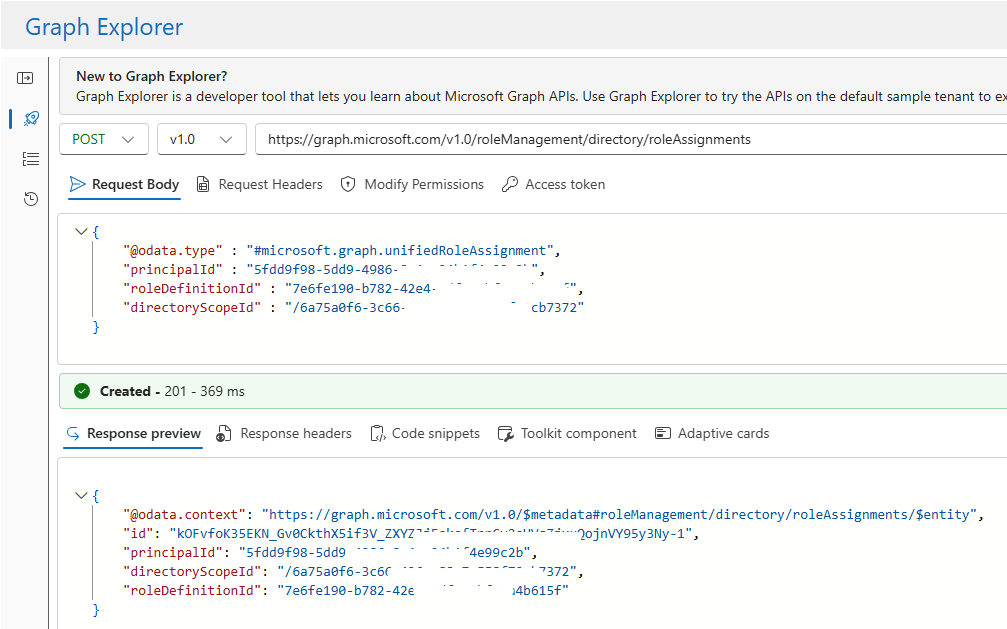 So we will issue a POST request to https://graph.microsoft.com/v1.0/roleManagement/directory/roleAssignments with the following payload: