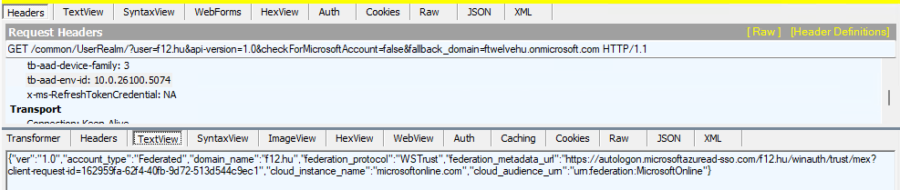 ":"microsoftonline.com","cloud_audience_urn":"urn:federation:MicrosoftOnline"}*in case of the on-premises domain, the fallback_domain needs to be specified in the URL. I didn’t find any trace of how this information is fetched, but it is an easy task so I didn’t investigate that part (any verified domain’s fallback domain can be queried).