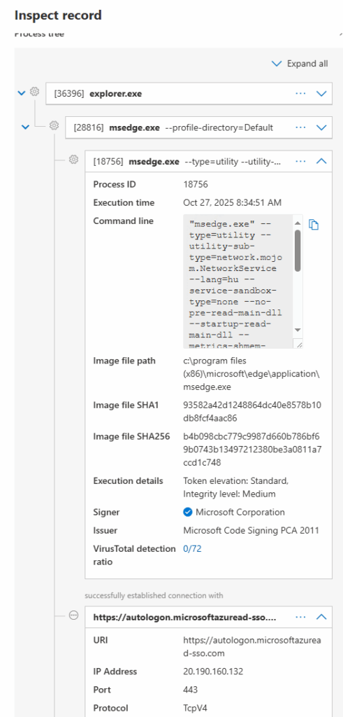 | sort by TimeGenerated desc This will return an enormous amount of events that I wasn’t able to process – but revealed some funny circumstances (like computer accounts that didn’t successfully finish the hybrid join process; or that Edge attempts to reach this URL when running as a network service [probably some update mechanism])