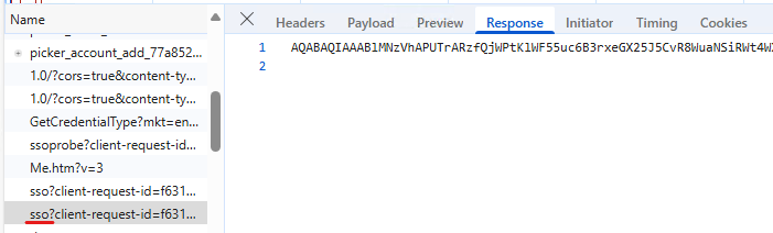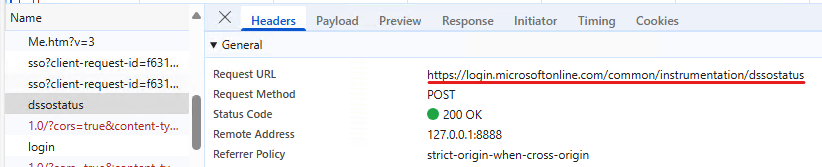This is followed by a POST to the https://login.microsoftonline.com/common/instrumentation/dssostatus endpoint, which returns some additional cookies (fpc) used during authentication: