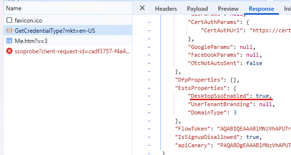 After entering the username, the GetCredentialType endpoint (https://login.microsoftonline.com/common/GetCredentialType?mkt=en-US) returns the EstsProperties which contains a “DesktopSsoEnabled” node with “true” value: