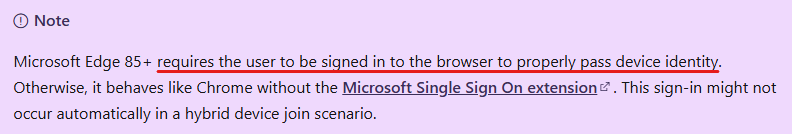 Edge: the docs state that Edge 85+ requires the user to be signed in to the browser to properly pass device identity: